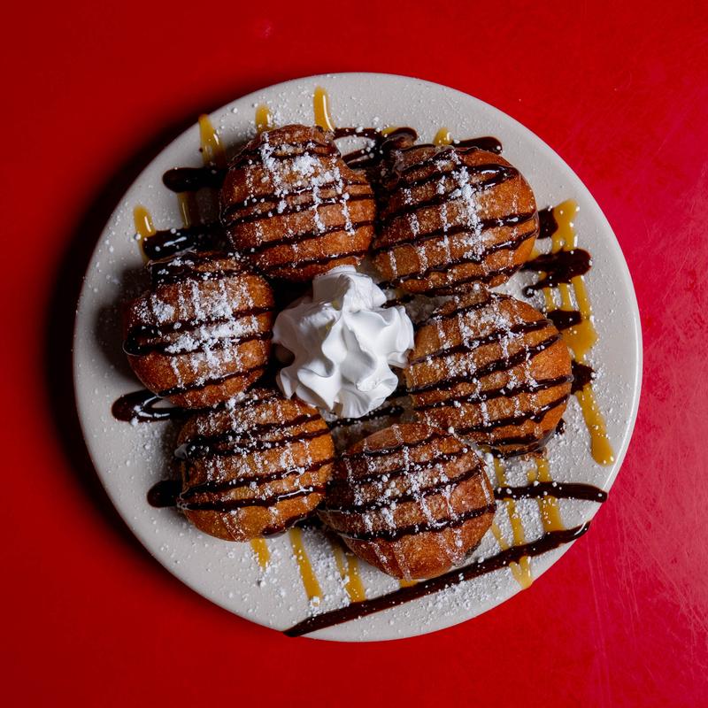 Pancake battered, topped with whipped cream, powdered sugar and drizzled with chocolate and caramel