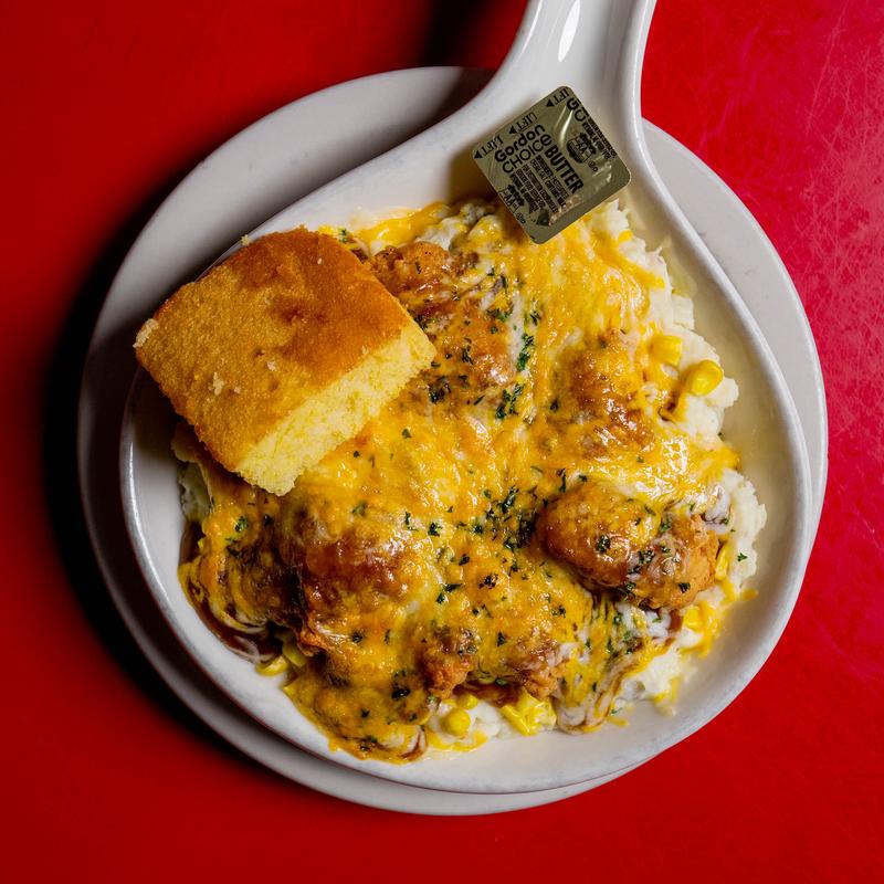 Baked over mashed potatoes with corn, brown gravy and cheddar cheese. Served with cornbread