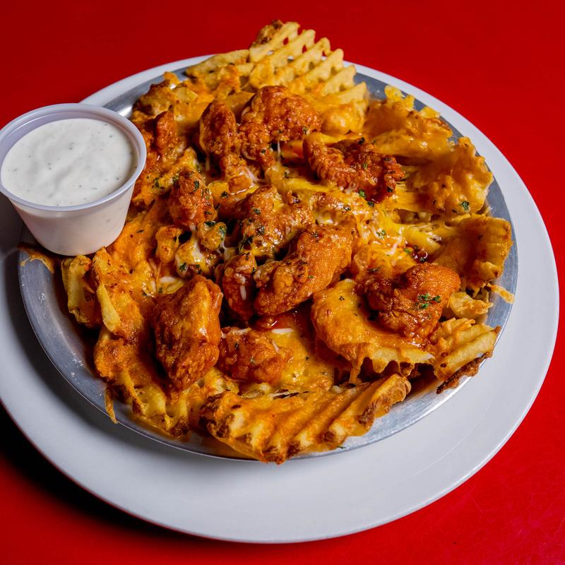 A regular helping of bacon cheese fries topped with your favorite nuggets