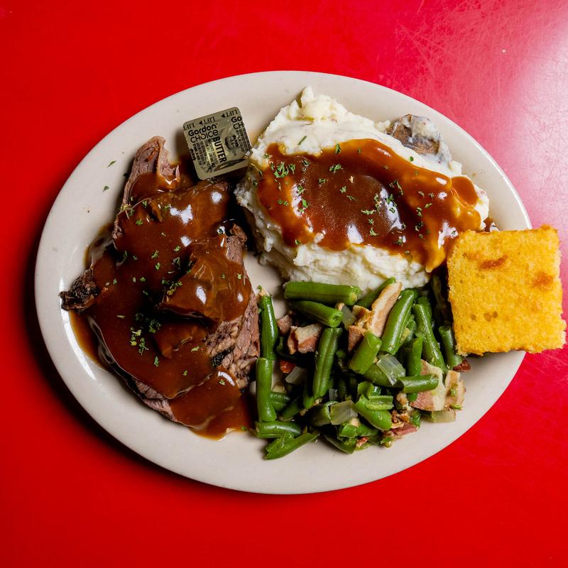 Served with mashed potatoes and gravy, green beans, and cornbread, dinner roll or garlic toast